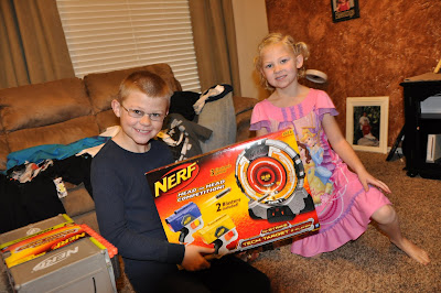 This weekend Carter and I decided to play a game of Nerf tag. Well, in the mean time, Christy and Cambree had gone downstairs and loaded up on Nerf guns and ammo. They came up blasting and before we knew it, we were having an all out Nerf gun war. Darts were flying every which way. The girls thought they could beat us, but it didn't take too long for them to give up. We had a lot of fun running around the house shooting each other. Our house was covered with Nerf darts by the time we were through.